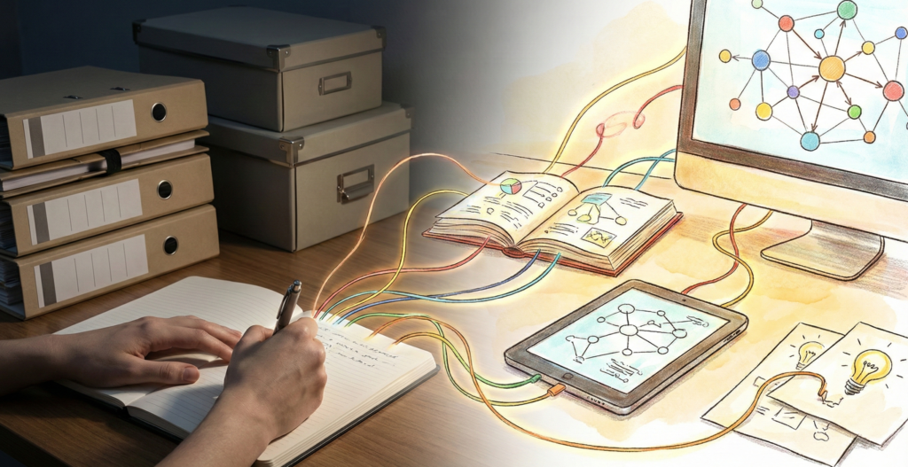 情報を「点」として箱に詰めるのではなく、「線」で結んでネットワークを広げていくイメージです。この習慣が身につくと、過去の何気ないメモが、今の悩みを解決する意外なヒントに変わる瞬間が増えていきます。